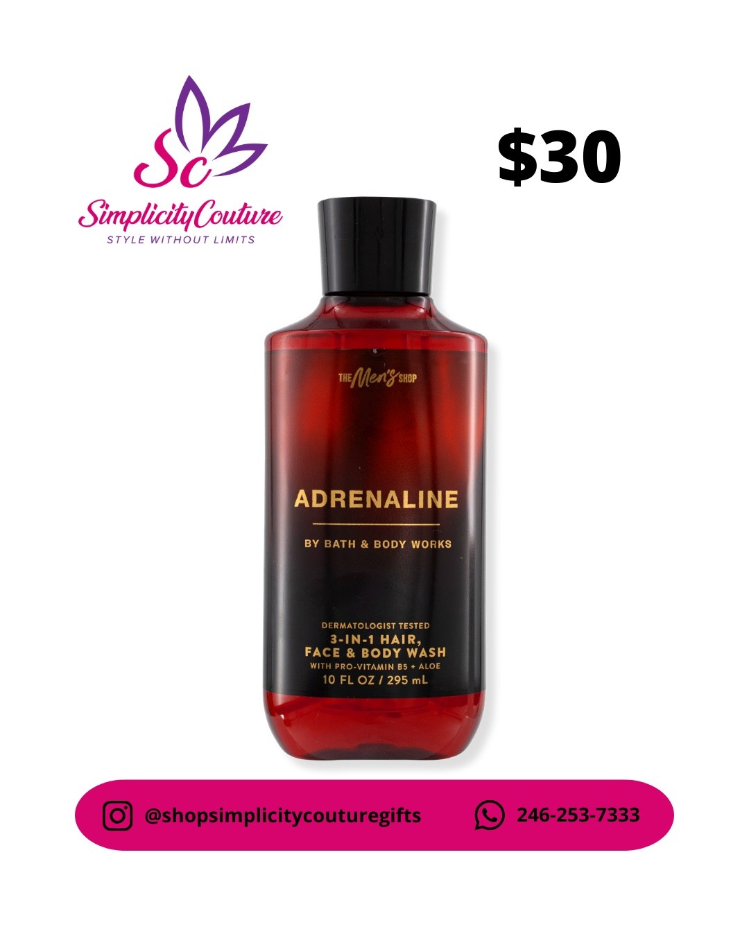 This Bath & Body Works Adrenaline 3-in-1 Hair, Face & Body Wash for men offers an all-in-one cleansing solution. Formulated with pro-vitamin B5 and aloe, it leaves you feeling refreshed with an energizing masculine scent. This dermatologist-tested wash comes in a 10 FL OZ (295 mL) bottle, perfect for an everyday grooming routine.