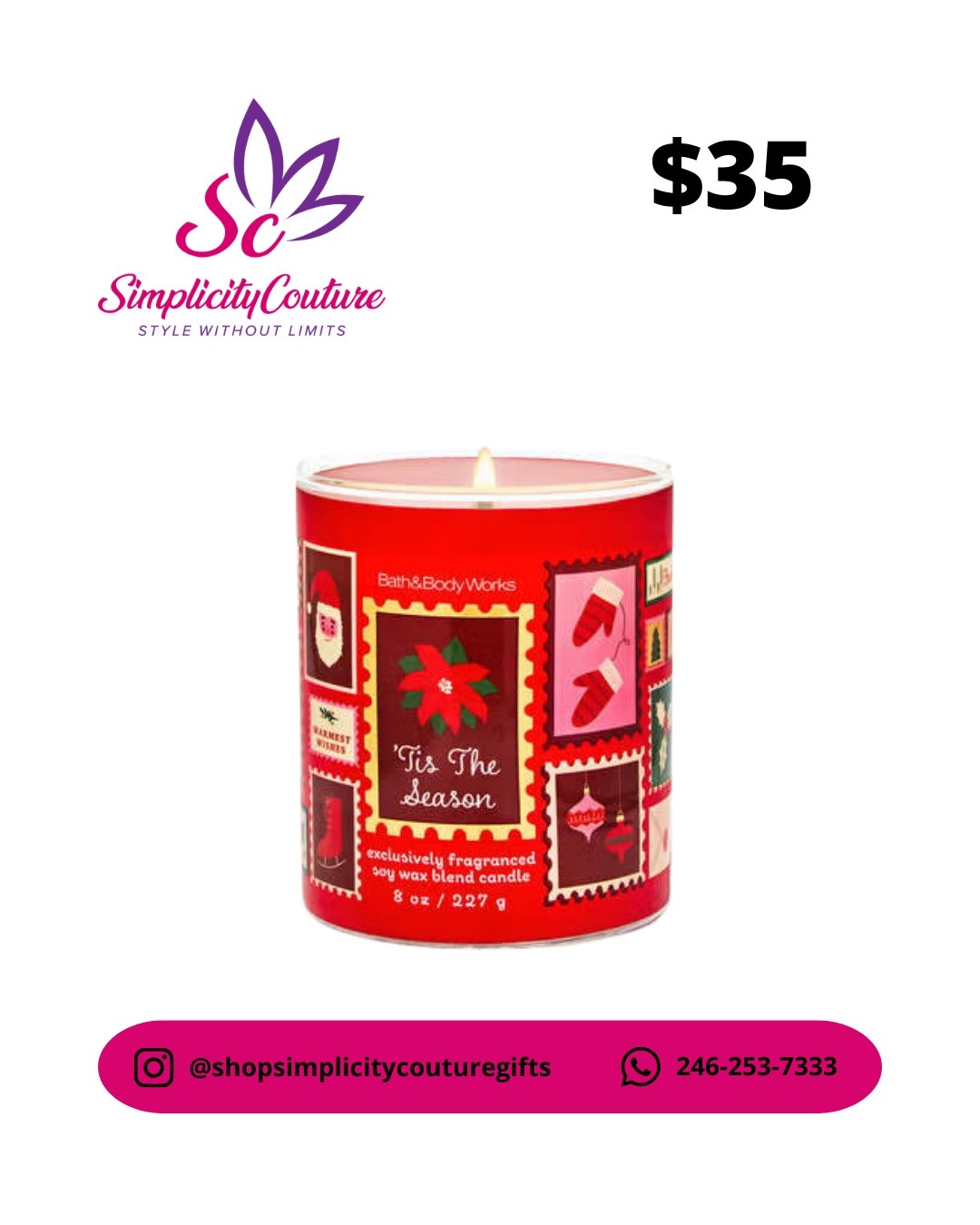 A festive Bath & Body Works ‘Tis The Season’ single wick candle, featuring a soy wax blend. This 8oz / 227g candle offers a cozy holiday fragrance with notes of apple, cinnamon, and cedarwood, perfect for creating a warm home ambiance.