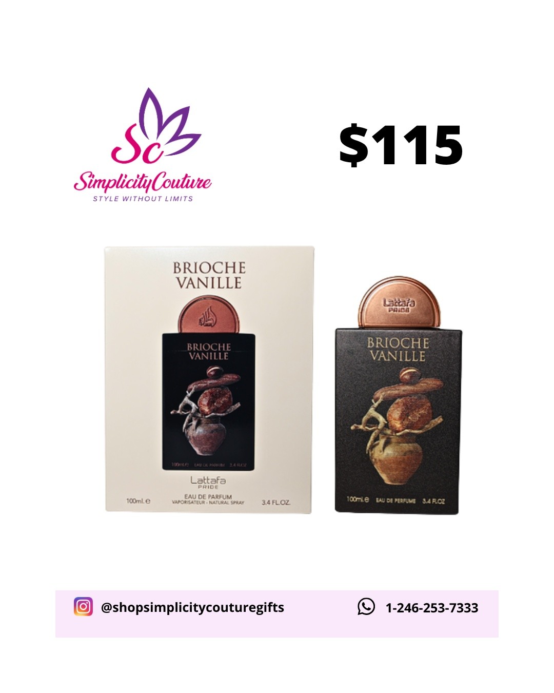 This Lattafa Pride Brioche Vanille Eau de Parfum comes in a 100ml (3.4 FL.OZ.) sleek black bottle, featuring a distinctive decorative element on its front. It is presented in a complementary cream-colored box.