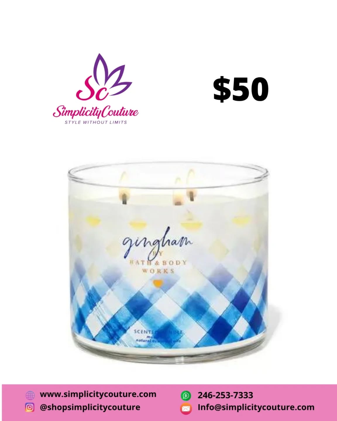 Experience the crisp, signature scent of the Bath & Body Works Gingham 3-Wick Candle. This candle features a refreshing blend of blue freesia, sweet clementine, and soft violet petals, designed to create a light and uplifting atmosphere. It offers a long-lasting burn and an even fragrance throw throughout your room.