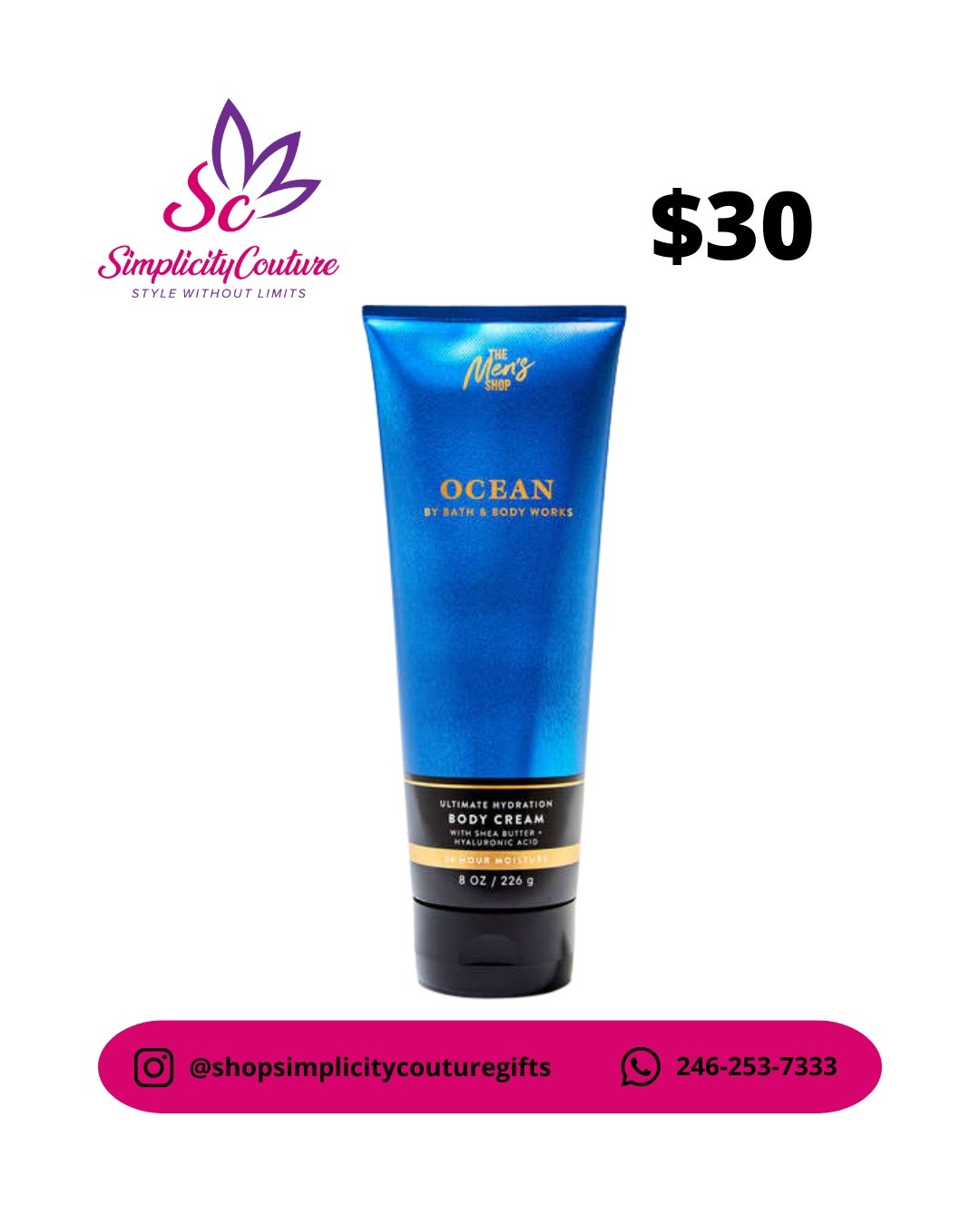 This Bath & Body Works Men’s Ocean Body Cream provides ultimate hydration with shea butter and hyaluronic acid. The rich moisturizing cream nourishes skin, leaving a fresh, clean scent with crisp aquatic notes. Available in an 8oz (226g) tube for long-lasting moisture.