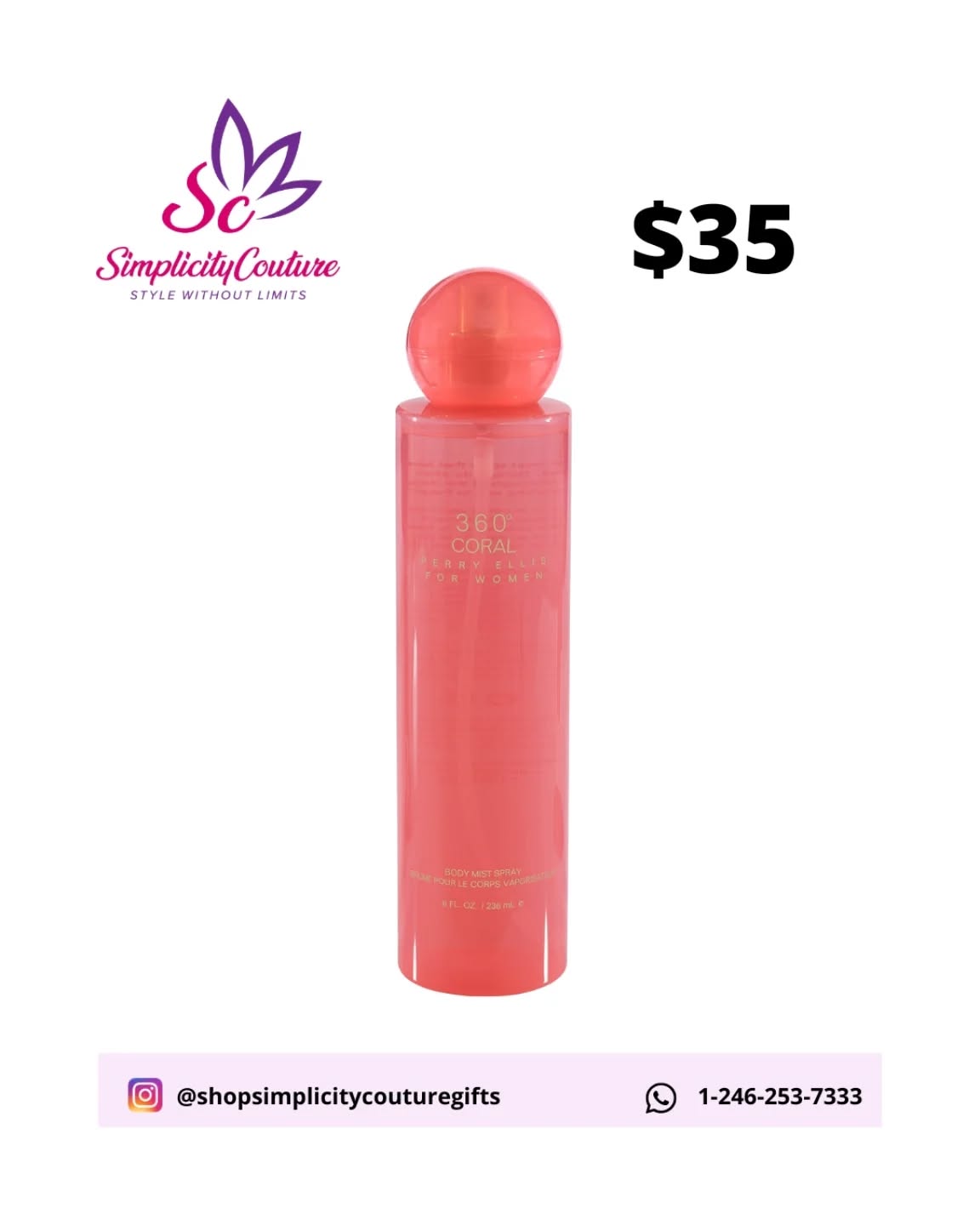 This Perry Ellis 360 Coral Body Mist for women offers a bright, fruity, and tropical fragrance. Light, sweet, and refreshing, it’s perfect for everyday wear. The bottle contains 8 fl oz / 236 ml of this easy-to-wear scent.