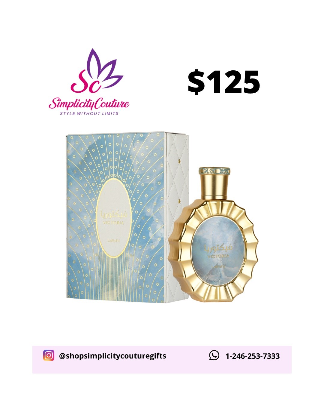 This Lattafa Victoria Eau de Parfum features an ornate gold-toned bottle with a light blue and white label, presented in a complementary light blue and gold patterned box. The fragrance comes in a 100ml (3.4 FL.OZ.) size.