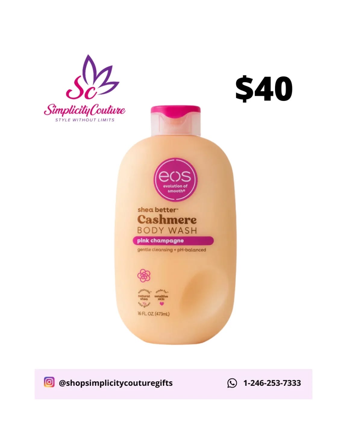 Experience the luxurious EOS Shea Better Cashmere Body Wash in Pink Champagne. This gentle, pH-balanced formula is made with natural shea and is suitable for sensitive skin, leaving your skin soft and smooth. Available in a 16 fl oz (473ml) bottle.