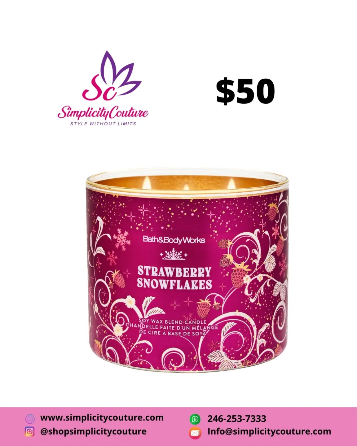 Indulge your senses with the Bath & Body Works Strawberry Snowflakes 3-Wick Candle. This soy wax blend candle features a dreamy mix of fresh strawberries, whipped cream, and icy notes, creating a sweet and cozy, room-filling fragrance with a long-lasting burn.