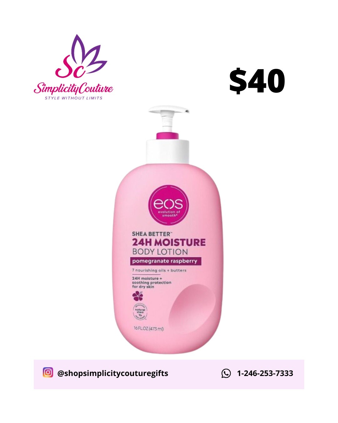 Experience deep, long-lasting hydration with EOS Shea Better 24H Moisture Body Lotion in Pomegranate Raspberry. This rich formula, infused with 7 nourishing oils and butters, provides soothing protection for dry skin and leaves a vibrant, fruity scent. Available in a 16 FL OZ (473 ml) pump bottle.