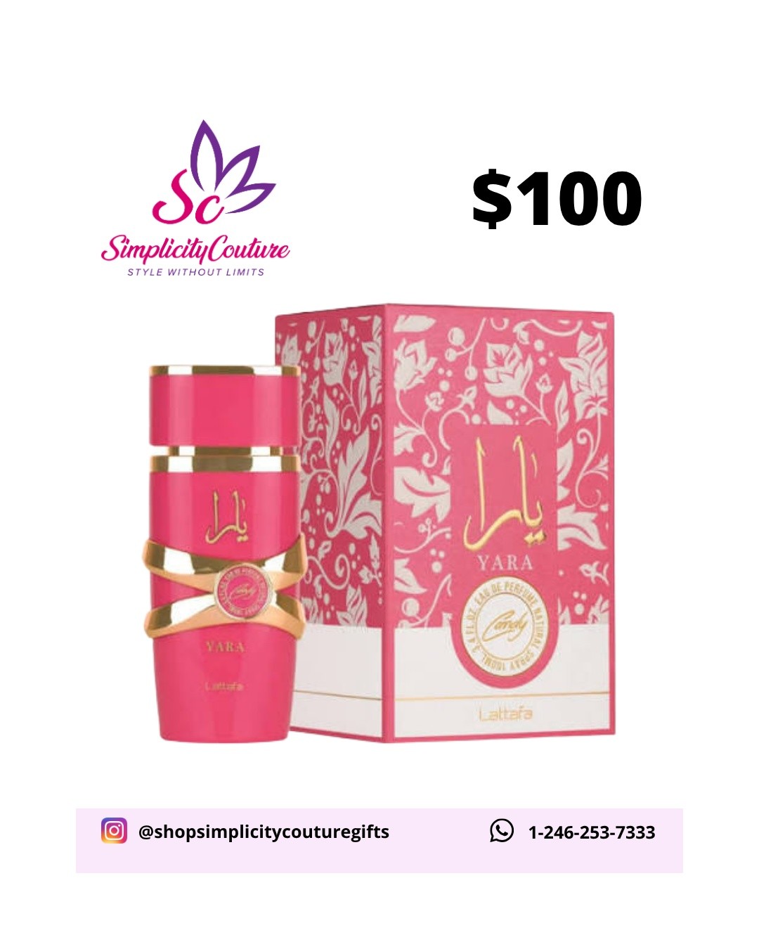 This women’s Eau de Parfum features a distinctive pink bottle with elegant gold accents and a matching box adorned with an intricate geometric lattice design. The fragrance is from Lattafa, named Yara, offering a unique aromatic profile.