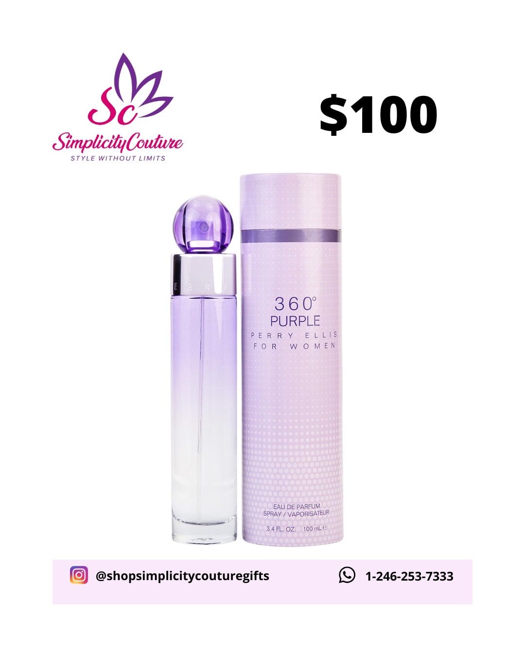 This Perry Ellis 360 Purple Eau de Parfum for women offers a soft, floral, and beautifully feminine fragrance. It’s a graceful, light, and long-lasting scent, perfect for everyday wear or special occasions. This elegant perfume comes in a 3.4 fl. oz. (100 mL) bottle.